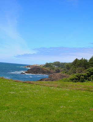 Another view of the Devil's punchbowl and the gorgeous rocky coastline. We arrived on Friday night, on a cloudy, drizzly (aka typical) day on the Oregon coast (I took these punchbowl photos on Sunday, actually) and it was pretty cloudy all Saturday too. We were the guests of Dick Cutler and the Inn at Otter Crest, an awesome condo and hotel/resort in Otter Rock, Oregon where I'd stayed on my last year's trip also. I didn't get a photo but it has the coolest "tram" that takes you from the parking lot at the bottom of the hill to the lodge units which are placed up a steep mountainside. We were at the very top! It is sort of like an elevator, and it went pretty slow, but it was kind of a fun experience. Especially when a group of kids were in it with us, and we were going downhill, and one of the young ones said, "is this moved by people power?" Out of the mouths of babes! Ha!